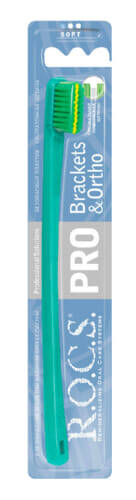 Новая мягкая зубная щетка R.O.C.S. PRO «Brackets & Ortho» разработана для обеспечения профессионального ухода за полостью рта при использовании ортопедических и ортодонтических конструкций. Щетка качественно удаляет зубной налет с эмали, брекетов и т.д., не царапая их и не повреждая десны. ОСОБЕННОСТИ ФОРМЫ Щетка зубная РОКС ПРО «Brackets & Ortho» (мягкая) идеально подходит для брекетов. Она имеет специально разработанную изогнутую тонкую ручку, которая предотвращает чрезмерное давление на десны и другие мягкие ткани ротовой полости. При этом, обеспечивается высокая маневренность щетки на всех участках зубного ряда, что делает ежедневную гигиену рта эффективной и комфортной.